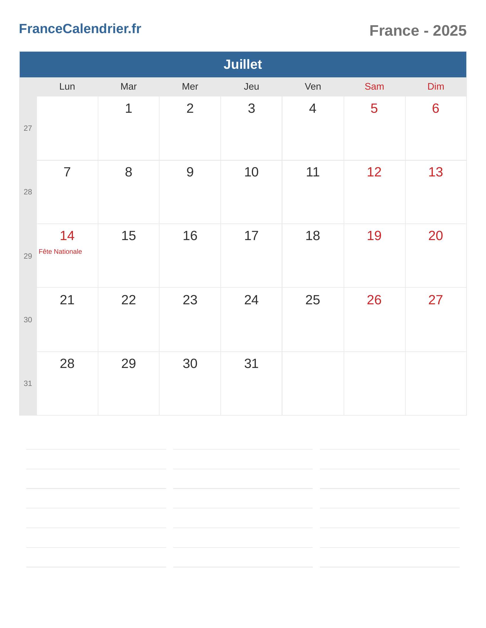 Calendrier du France 2025 - Juillet