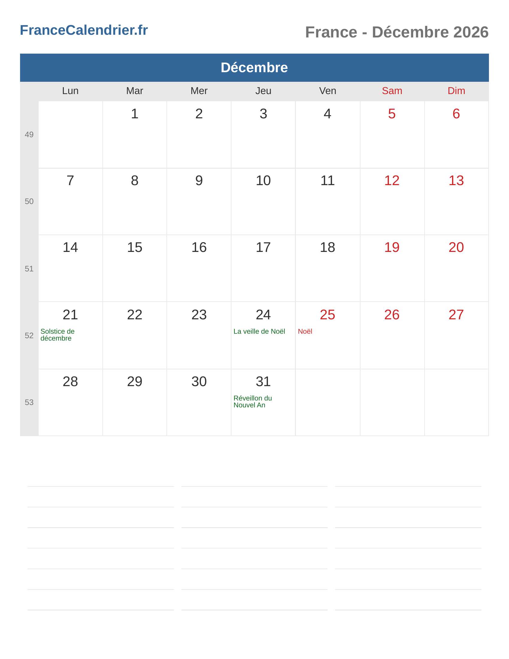 Calendrier Décembre 2026 - France