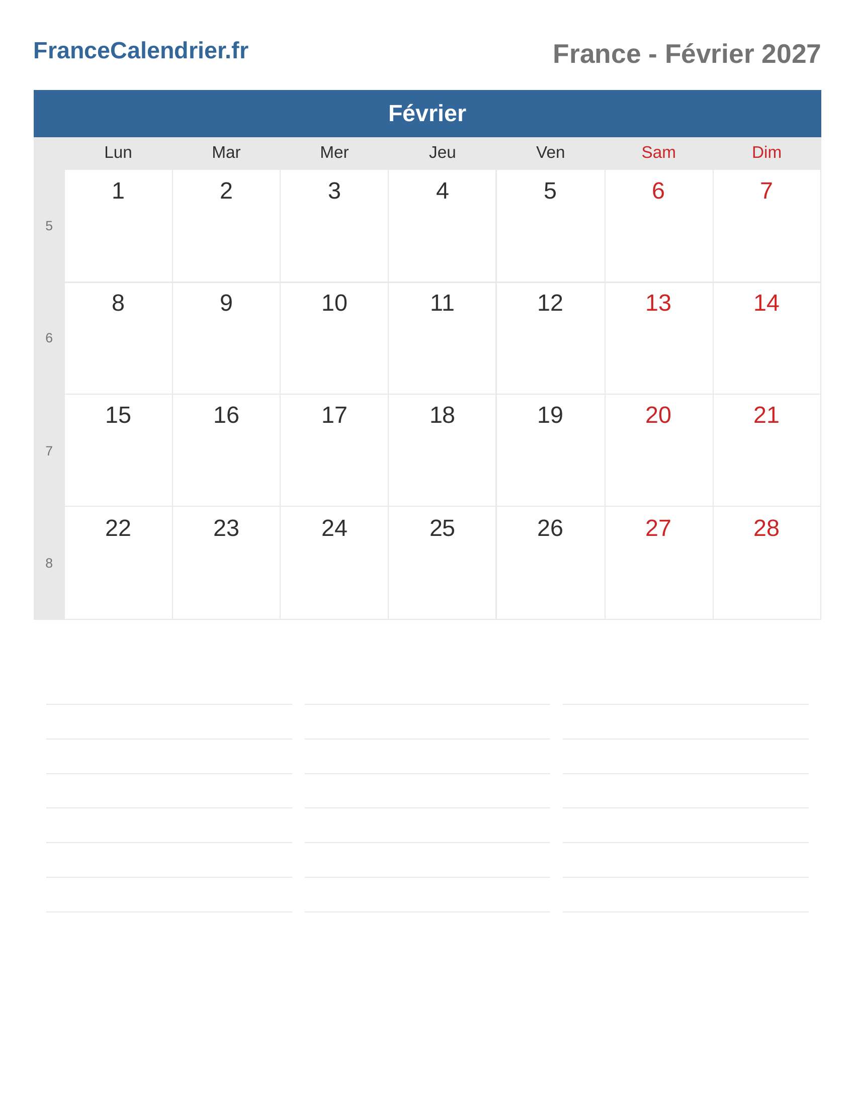 Calendrier Février 2027 - France