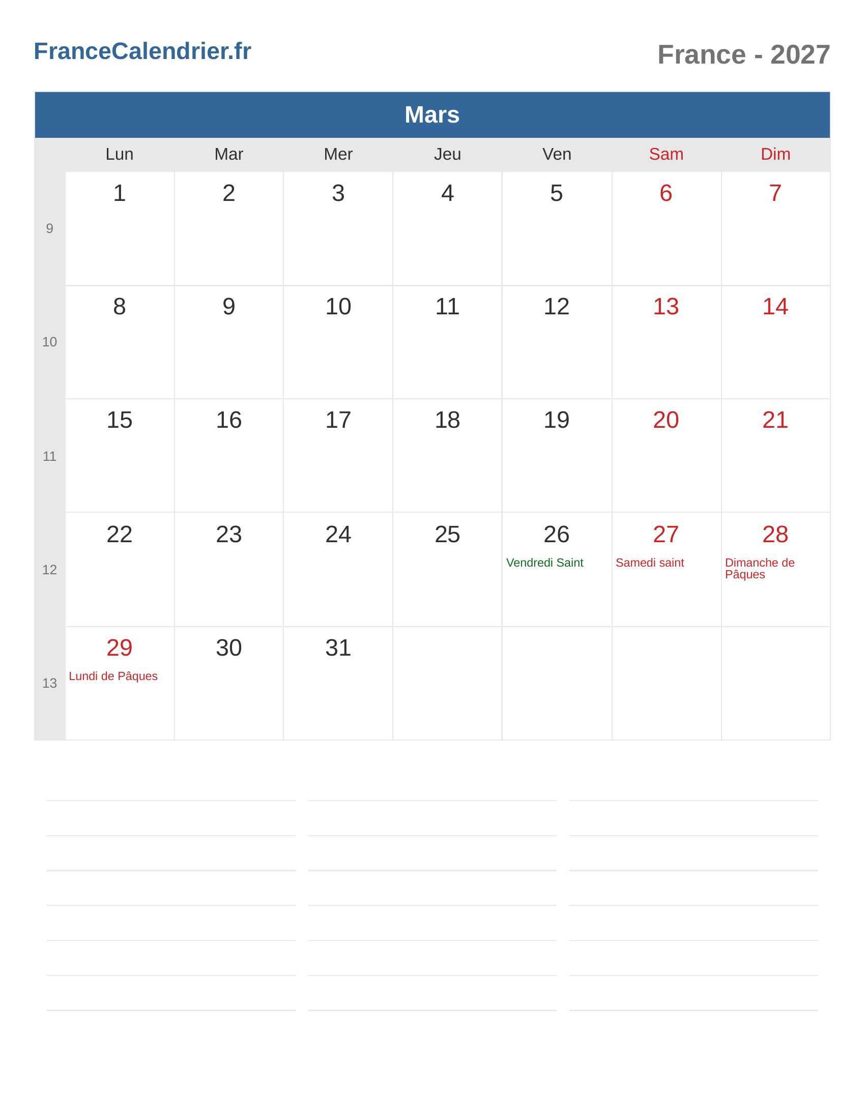Calendrier Mars 2027 - France