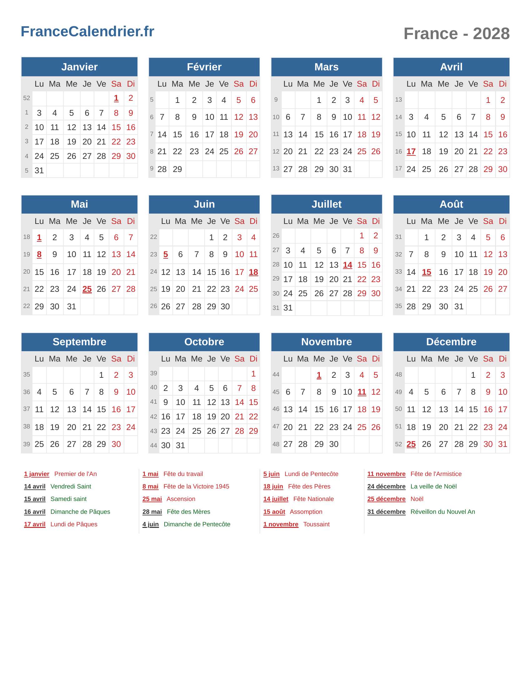 Calendrier 2028 - France
