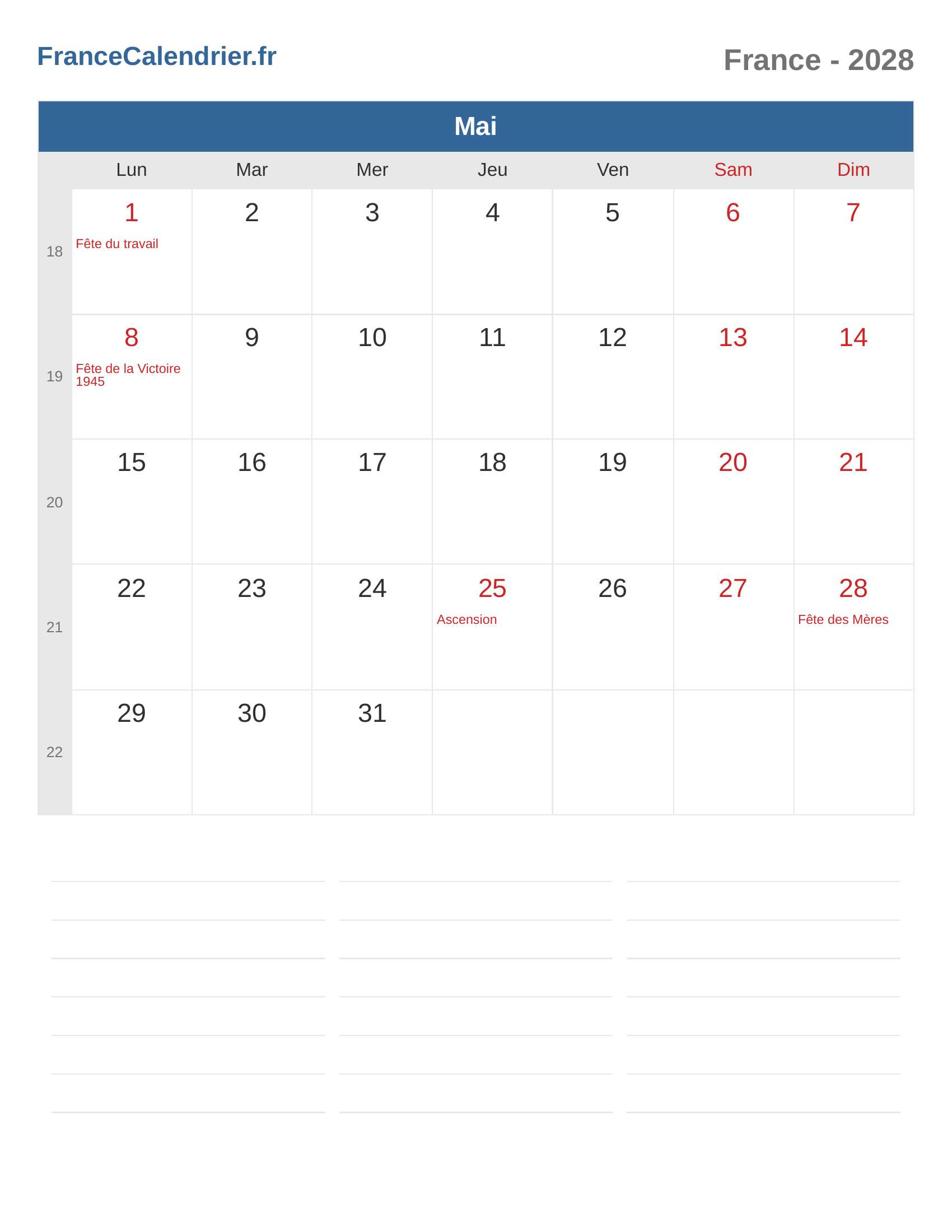 Calendrier Mai 2028 - France