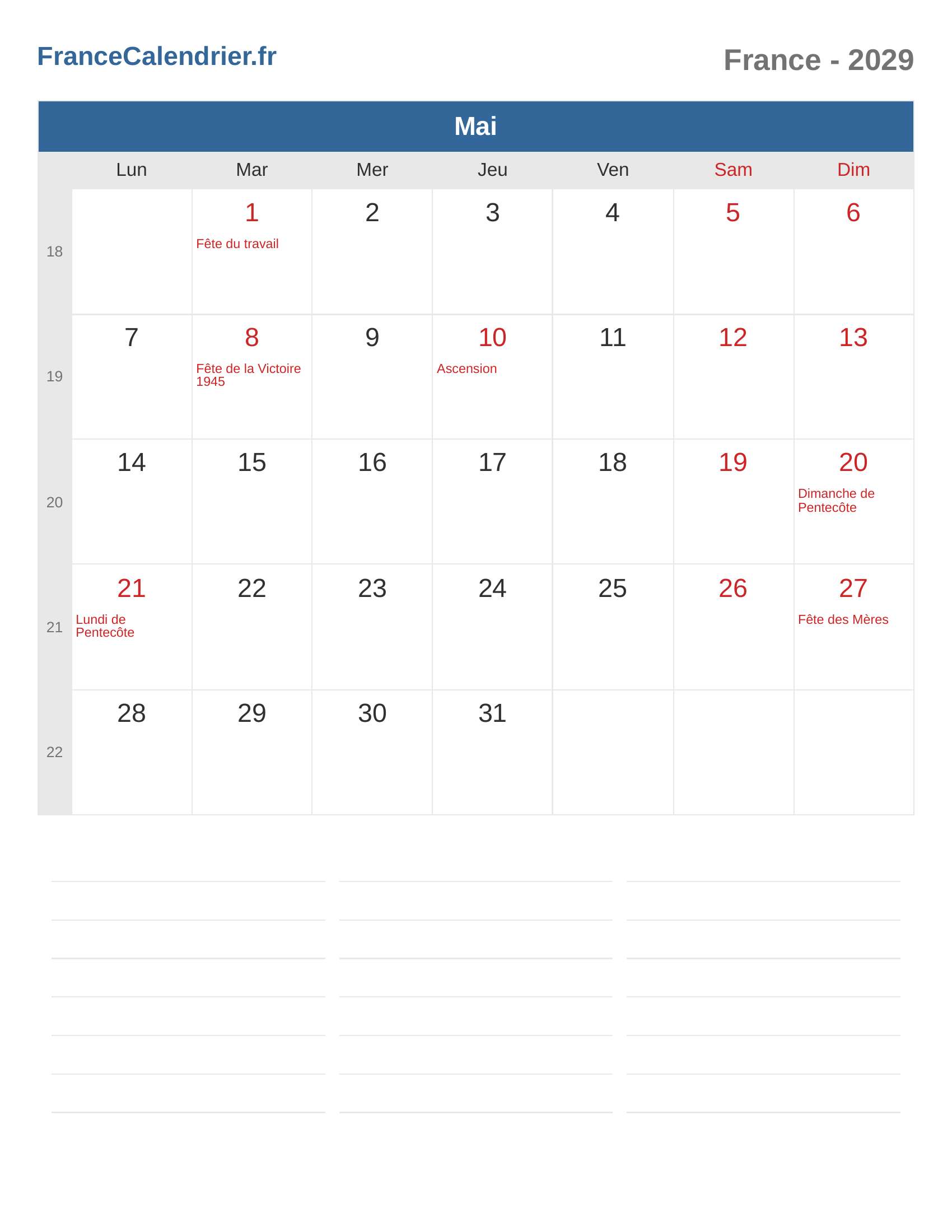 Calendrier Mai 2029 - France